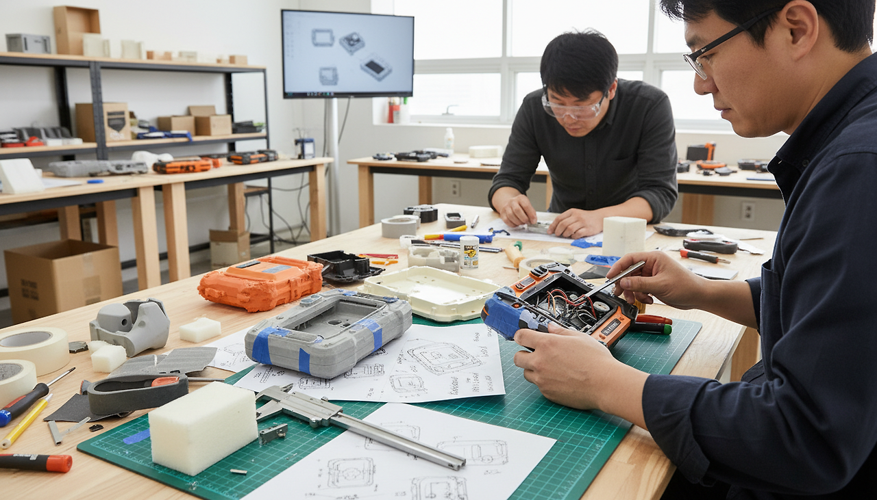외골격 설계: 우리는 내부 프레임과 외부 케이스를 일체화하는 구조를 제안했습니다. 이는 부품 사이의 유격을 0에 가깝게 줄여 기기의 부피를 최소화하는 동시에, 외부 충격이 내부의 가장 취약한 부품을 피해가도록 에너지를 분산시키는 공학적 설계였습니다.